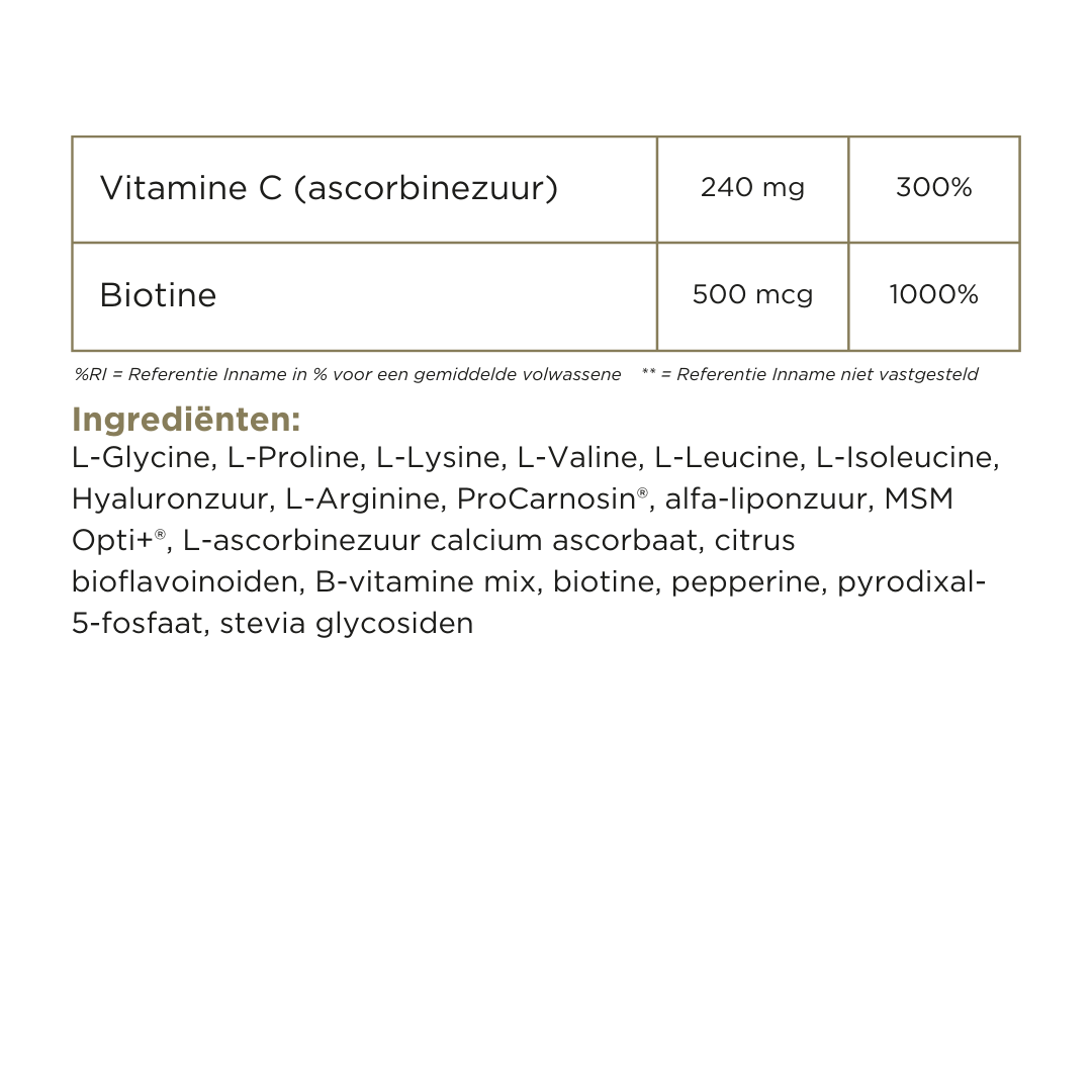 L-Glycine, L-Proline, L-Lysine, L-Valine, L-Leucine, L-Isoleucine, Hyaluronzuur, L-Arginine, ProCarnosin®, alfa-liponzuur, MSM Opti+®, L-ascorbinezuur calcium ascorbaat, citrus bioflavoinoiden, B-vitamine mix, biotine, pepperine, pyrodixal-5-fosfaat, stevia glycosiden.