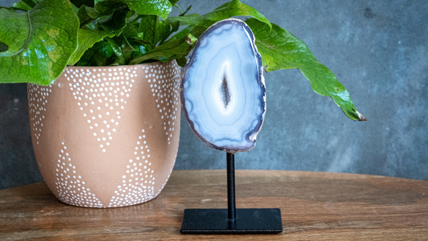 Agaat – Deze aardende steen werkt rustgevend op het zenuwstelsel en helpt om emoties in balans te brengen. De agaat op standaard is prachtig om in een ruimte te plaatsen waar je tot rust wilt komen, zoals de woonkamer of slaapkamer.