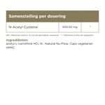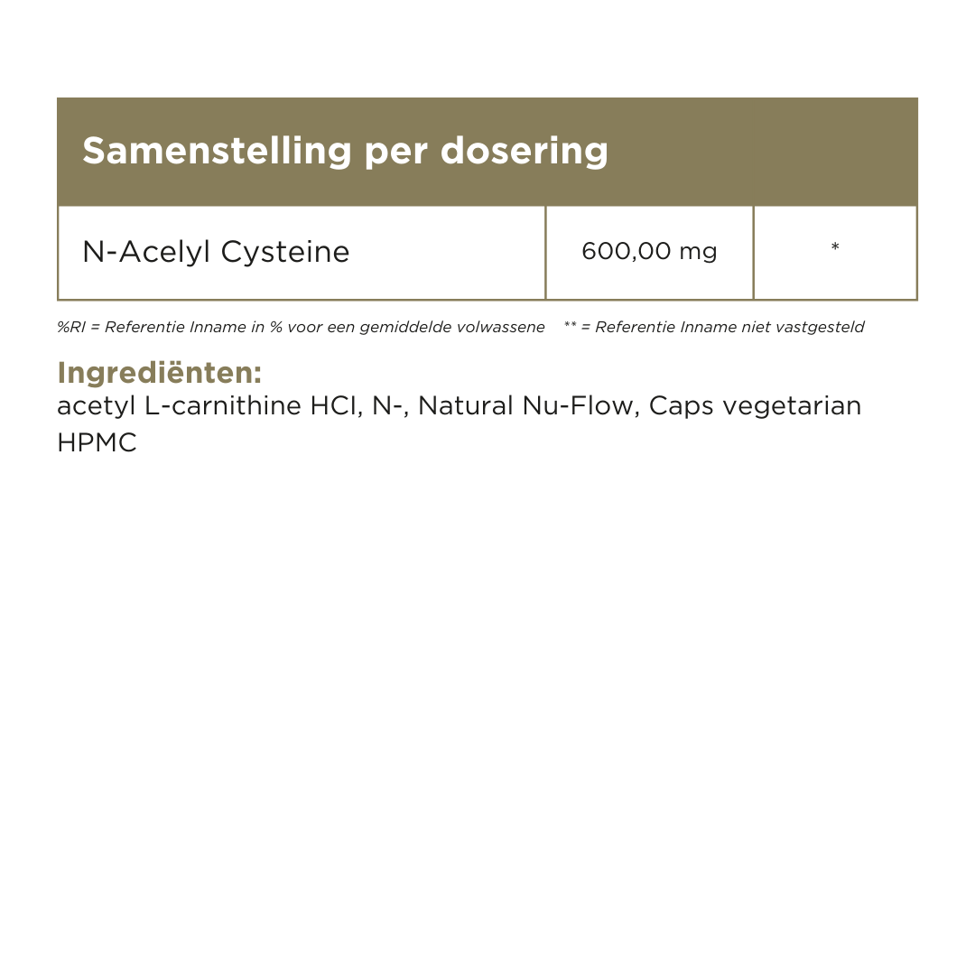 De werking NAC staat voor N-Acetyl-L-Cysteïne. Cysteïne is een semi-essentieel aminozuur. Ons lichaam vormt zelf cysteïne uit l-methionine. In NAC wordt cysteïne gekoppeld aan acetyl. Acetyl is een molecuuldeel.